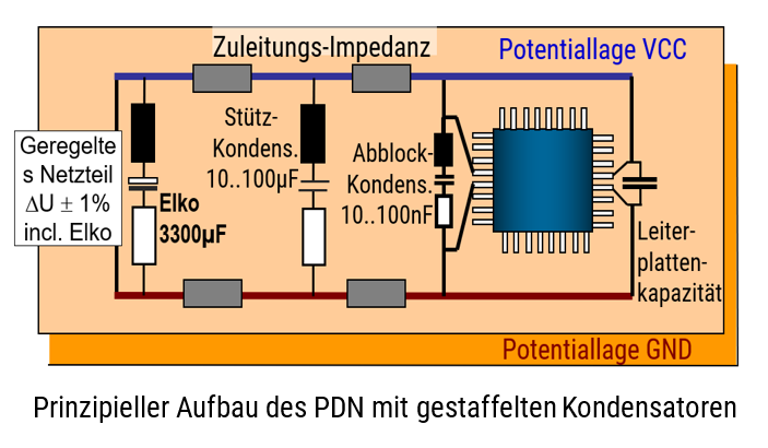 Allerdings reicht die Kapazität dieses Leiterplattenkondensators von wenigen nF nicht aus, den Ladungsbedarf stromstarker, schaltender Bauelemente zu befriedigen. Dies erfordert zusätzlich zum Stützkondensator an der Spannungsquelle (bzw. Einspeisung auf der Leiterplatte) den Einsatz weiterer Kondensatoren über der Potentialfläche verteilt. Diese dienen gleichzeitig auch als Verbindung zwischen GND und VCC für die Rückströme der Signale die über VCC-Lagen geroutet sind.