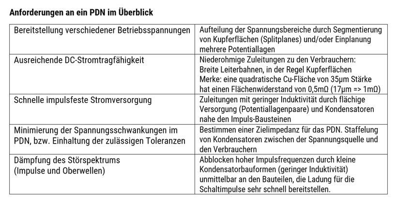 Schwerpunkt der Planung des PDN ist die stabile, impulsfeste Stromversorgung schnell schaltender Bauteile. Dabei steht zunächst die Sicherstellung der impulsartigen Stromzufuhr der Bauteile im Vordergrund, die durch die Zuleitungsinduktivität gemäß Δi/Δt ≤ U0/L begrenzt wird. Bei vorgegebenen Spannungen sowie den tolerierbaren Spannungsabfällen am Bauteil muss vielfach auch die Induktivität der Stromzufuhr so klein wie möglich konstruiert werden. Dies ist essentiell für die Funktion schnell schaltender, stromstarker Bauteile. Für eine geringe Zuleitungsinduktivität ist eine flächige Stromzufuhr Voraussetzung. Gleichzeitig muss die zugehörige GND-Bezugsfläche/-lage so dicht wie möglich unter dieser Stromzufuhr angeordnet sein. Vollflächige, eng beieinander liegende Potentiallagen bilden eine ideale Stromversorgung.